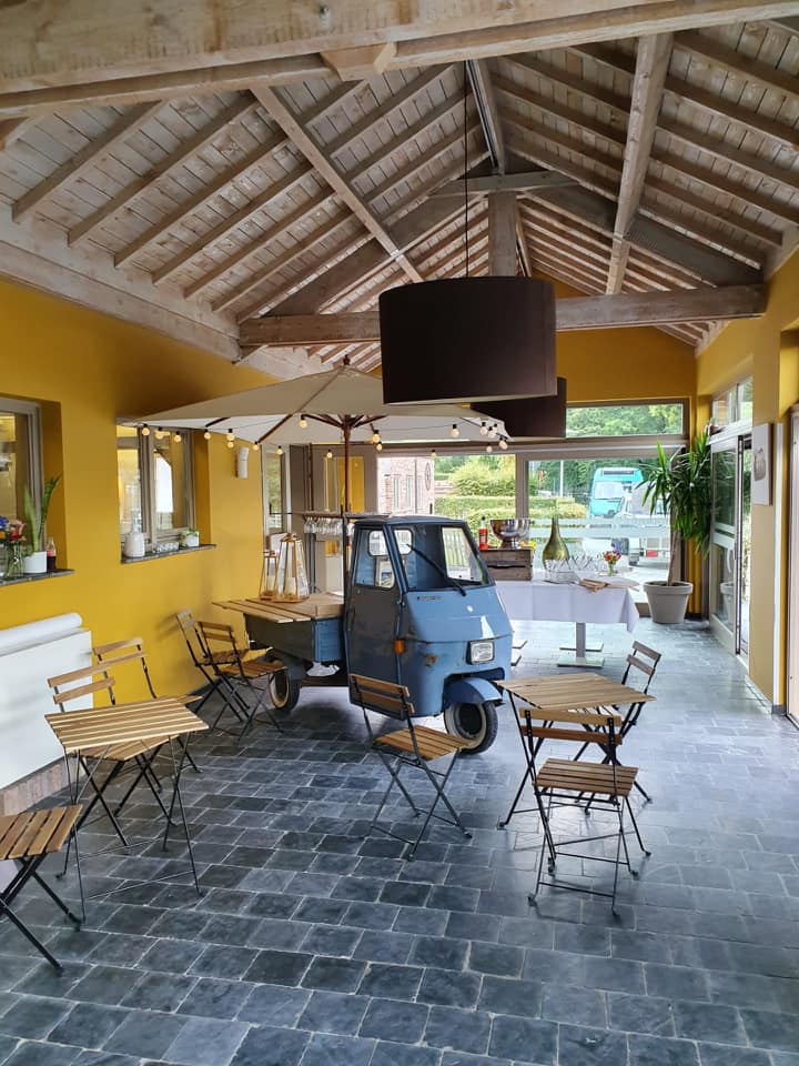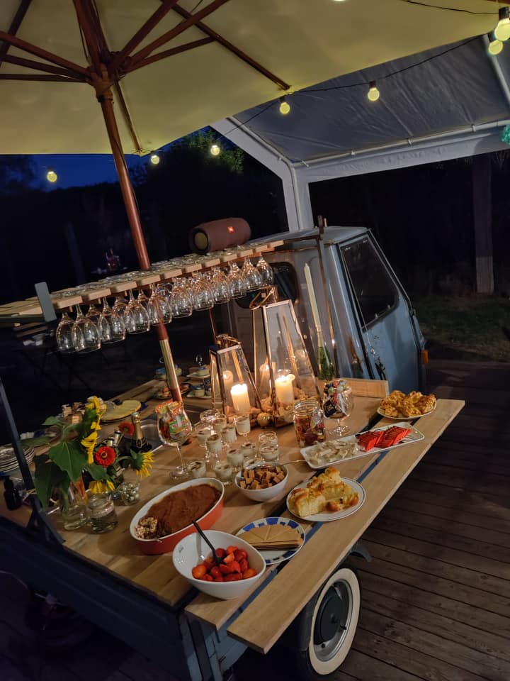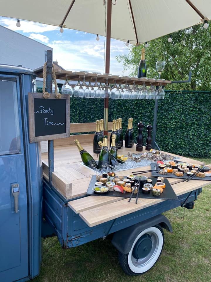 Doordat de zijschotjes horizontaal gekanteld kunnen worden nemen ze de functie aan van bar toogjes waar telkens twee stoelen aan geplaatst kunnen worden. Om deze sfeer door te trekken zijn er extra bijhorende tafeltjes en stoelen voorzien. En natuurlijk horen bij een bar ook glazen. Op ooghoogte is er een luxe houten glazenrek geplaatst waaraan 42 glazen gehangen kunnen worden. Om het plaatje helemaal af te maken staat er boven de piaggio een vierkante parasol van 2,5m met rondom sfeerverlichting.
